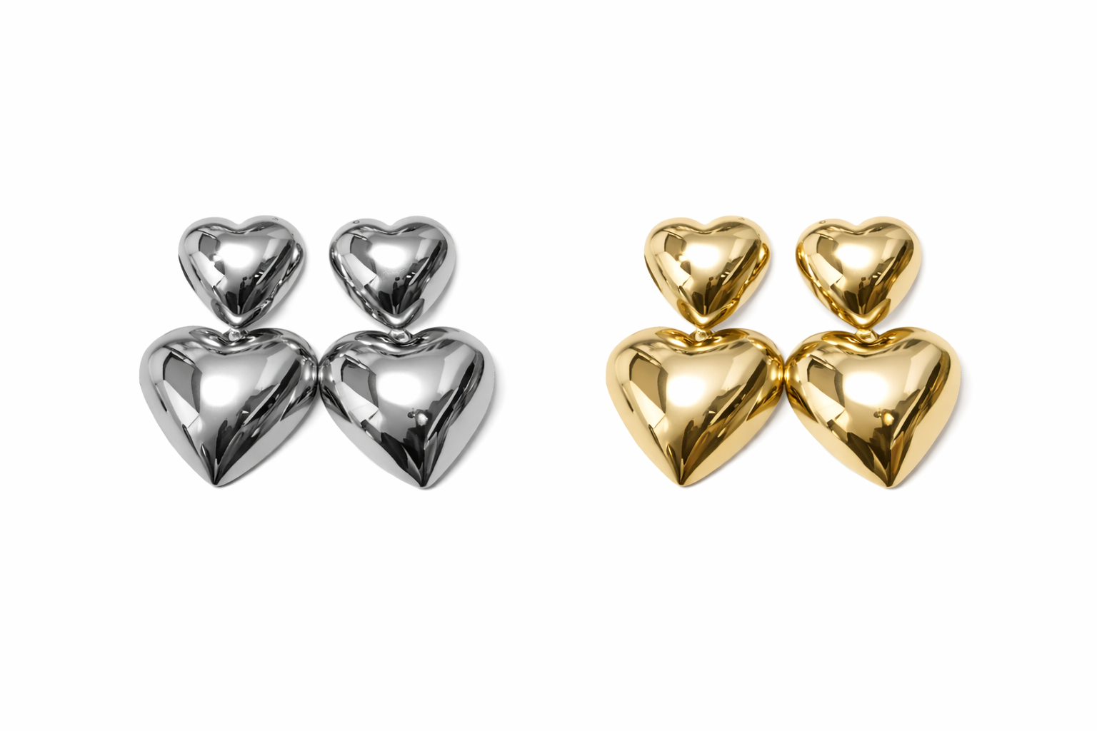 Brinco com design em coração duplo e acabamento espelhado, trazendo um visual moderno, elegante e cheio de personalidade.