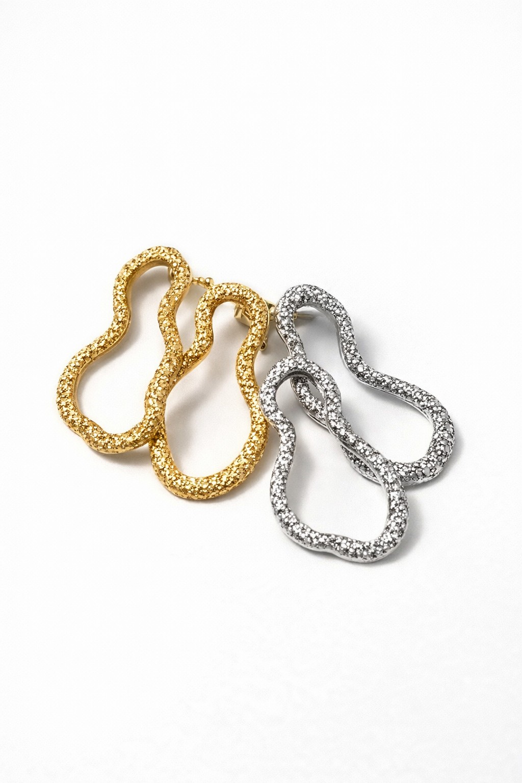 Brinco com design orgânico em formato fluido e acabamento texturizado com brilho sofisticado.
